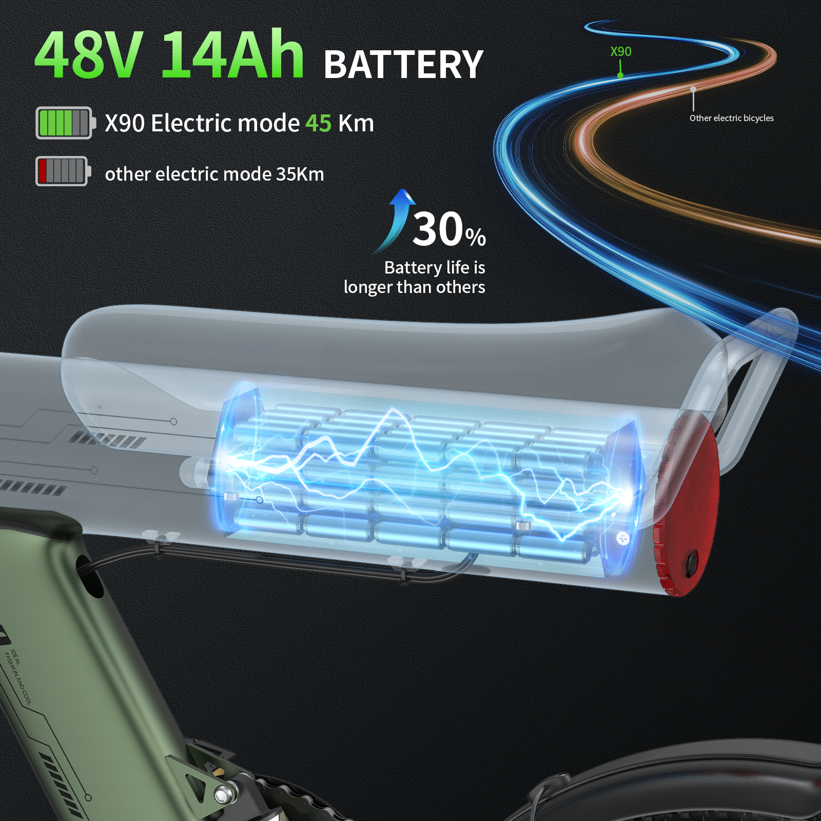 Equipped with a removable 48V 14Ah/672Wh battery, the X90 delivers up to 60 KM of range in pedal assist mode-perfect for extended adventures, letting you explore farther without power anxiety.