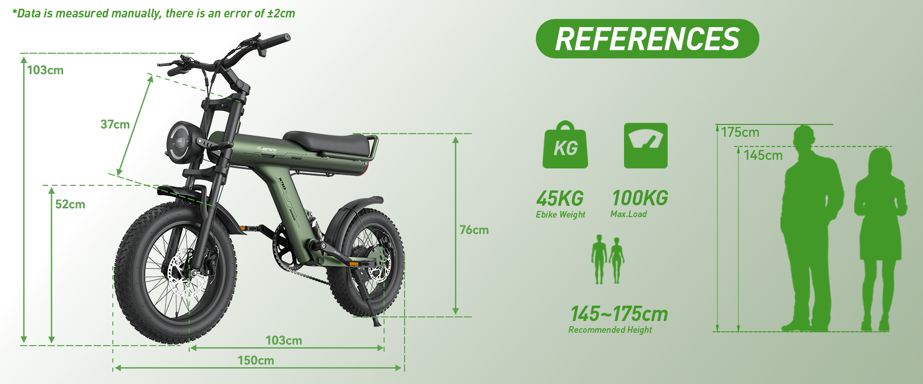 Jansno X90 eBike supports riders up to 100kg and accommodates heights from 145cm to 175cm. This inclusive build means a diverse range of users can all enjoy a ride that's both comfortable and steady.